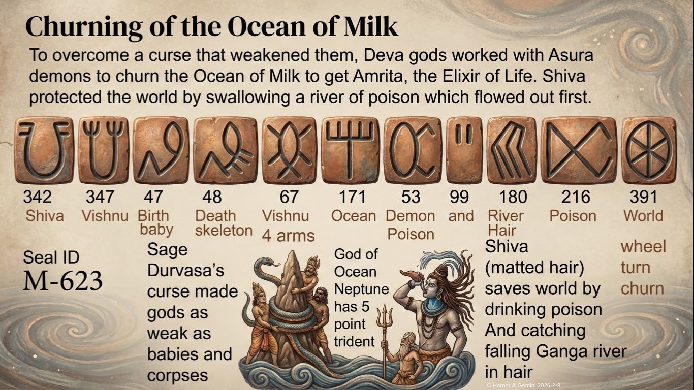 3rd eye). [1.4] Vishnu (fish with 4 arms). [1.5] Goddess (small fish with crown). [1.6] Of (double ticks). Plural (double ticks, "). [1.7] Heaven (wheel). Vishnu chakra (wheel). Vishnu turtle avatar (wheel). Line 2: Left to right, bostrophodon, zig zag like oxen plowing since this legend is about Gods and demons plowing and churning the Ocean of Milk to get the Elixir of Immortality. Line 2: [2.1] Plow. Farm plow, Egyptian mr hieroglyph. [2.2] Butter churn, symbolizing churning of ocean. [2.3] Vishnu (arms up, upholding the cosmos). [2.4] Shiva (Jar with wings, Sacrum bone with serpents emerging, crossed arms. God of yoga, Transformer, Destroyer. Line 3: Describe above, right to left. [3.1] Dead bird. The gods are dying from curse of Sage Durvasa, they are desperate for a cure. [3.2] Sea-shell used to drink Elixir. Thanks to Shiva drinking a shell of poison, the gods obtained Amrita. [3.3] Attributes of Shiva, his trident, weapons like bow and arrow, third eye. [3.7] Number three, recognizing this number sacred to Shiva. His has 3 eyes, a 3 pointed trident, and is a member of the trinity of Hindu primary gods, the Trimurti. (CCH 2026-2-11)
