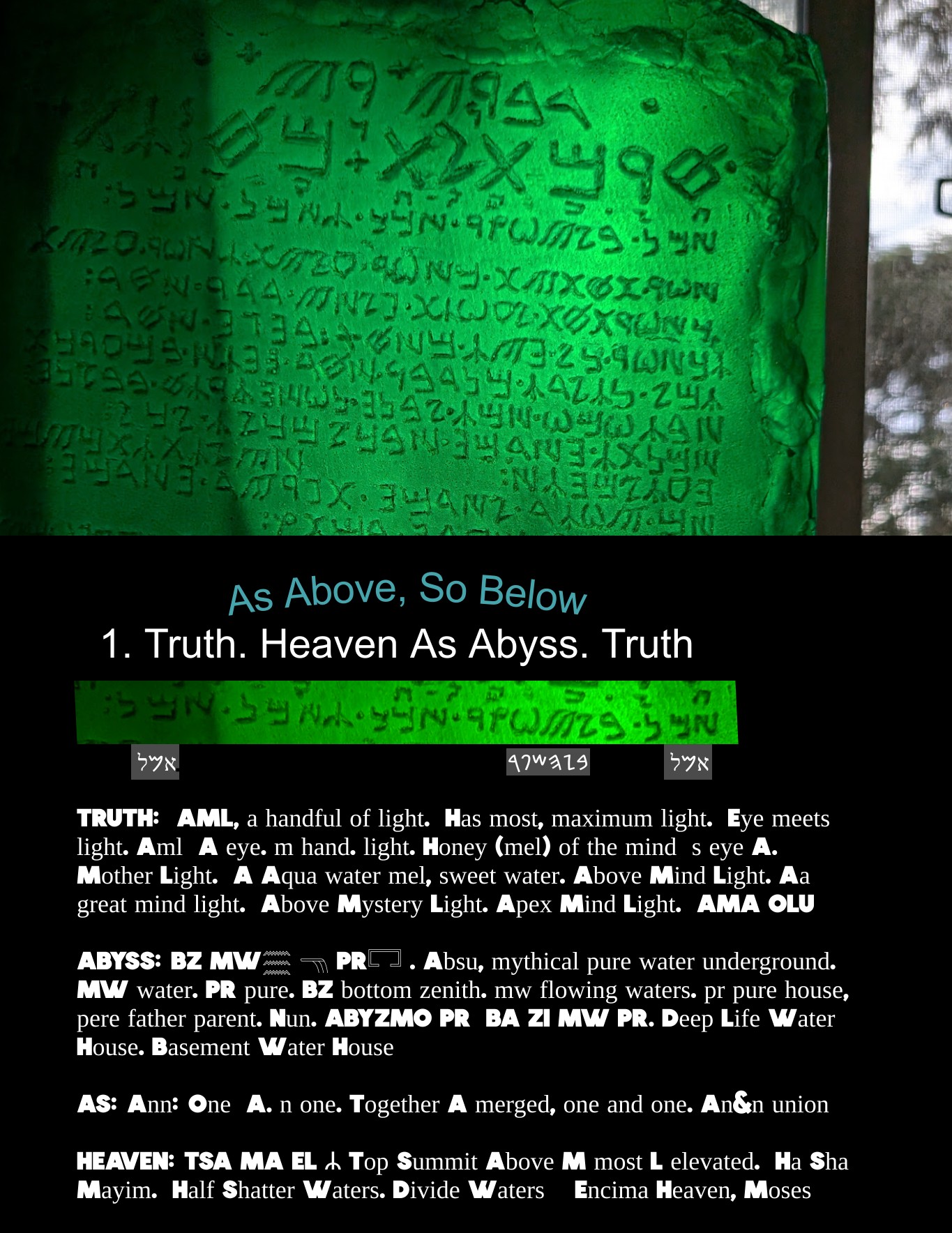 Verse 1 and Verse 2 combined: As Above, So below. Displays symmetry. Meta-linguistics contemplation: Character H=M=S=SH? HEMI SEMI Divider. Window, hand, pouring water. Esoteric variations. B=beyt=house balances PR house hieroglyph. Pure waters both in